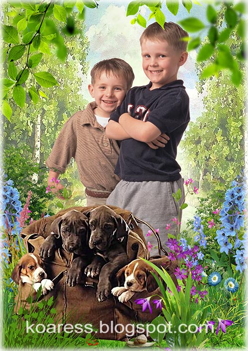 Шаблон для фотошопа со щенками на лугу для детских фото