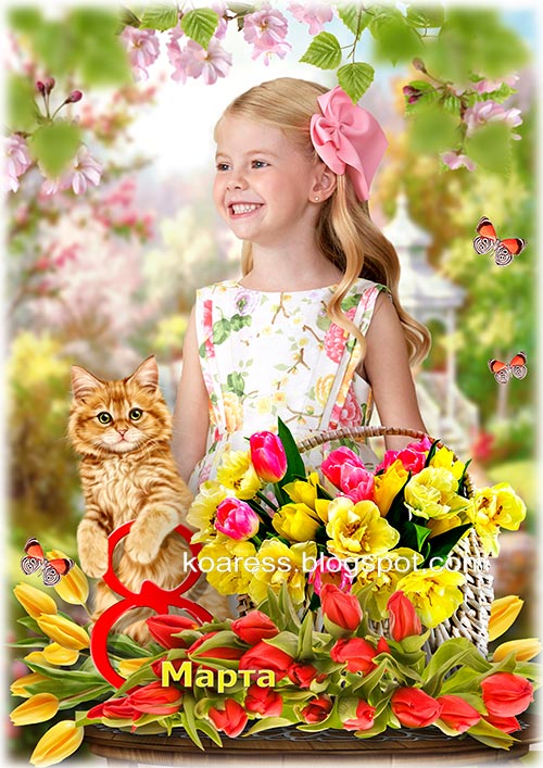Детская весенняя рамка-коллаж для детского сада к 8 Марта с тюльпанами и рыжим котенком