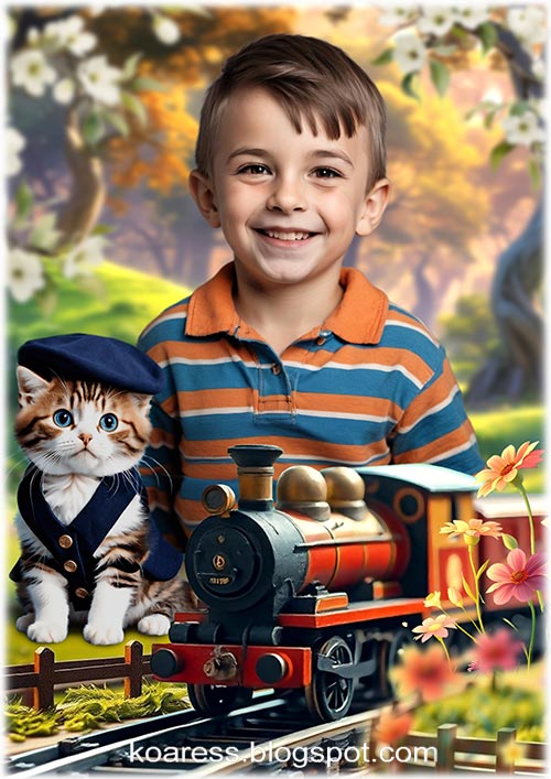 Многослойный детский коллаж для фотошопа - Мчит по лесу поезд наш